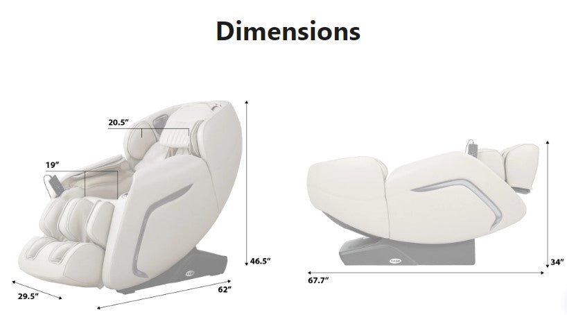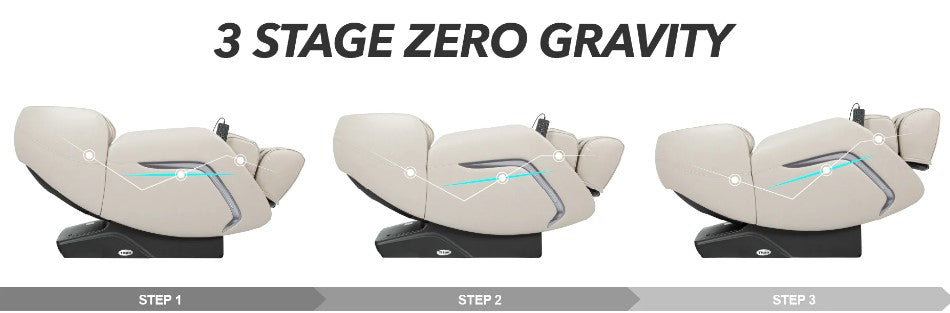 The Cosmo is equipped with 3 stages of zero gravity, giving the user a weightless feeling during the massage. This gives the user an option on how far back they want their chair to recline automatically, or you can adjust the chair manually with the remote.